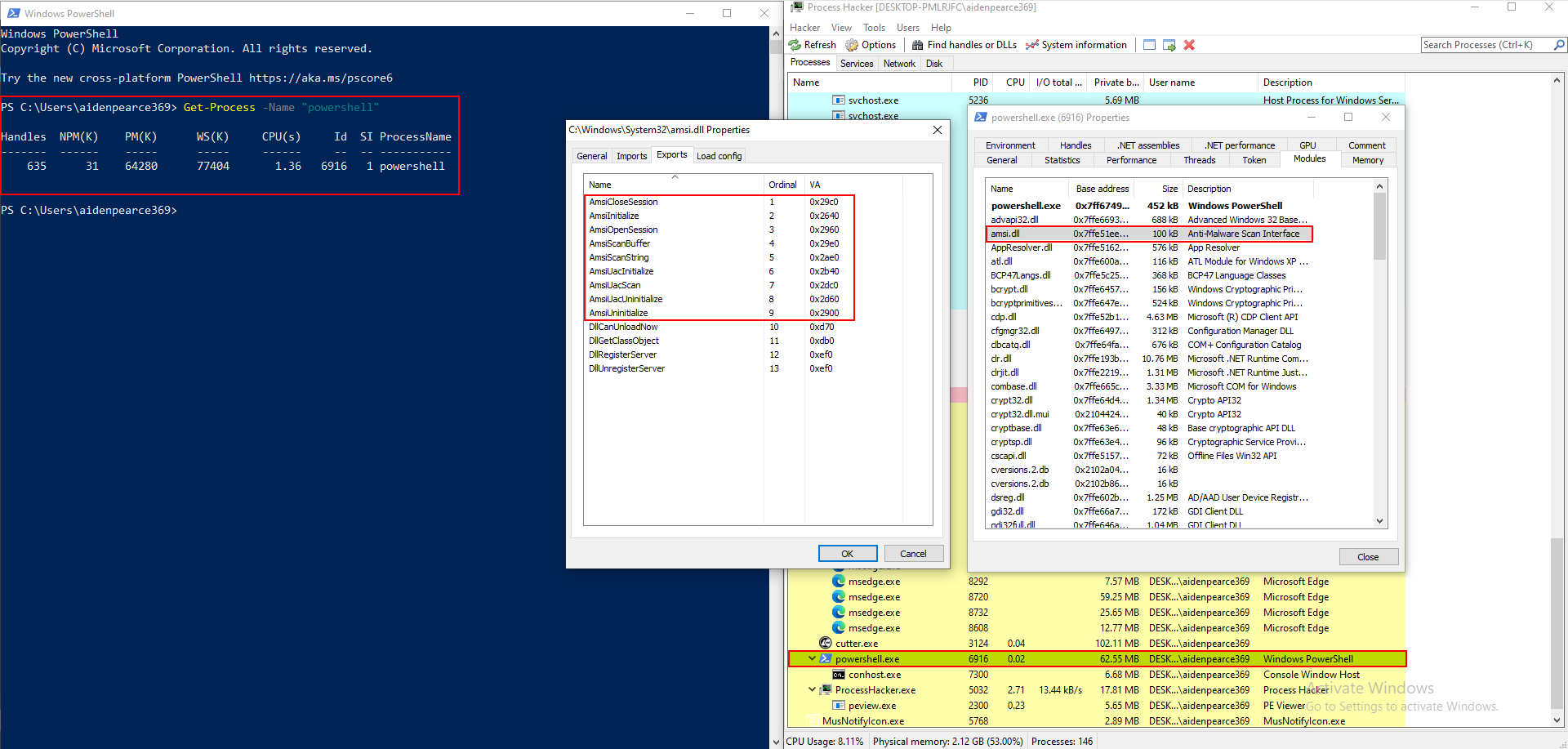 We know that amsi.dll is responsible for exporting these functions into the process with which AMSI is integrated with. Now lets use Process Hacker to see how it exports these functions.