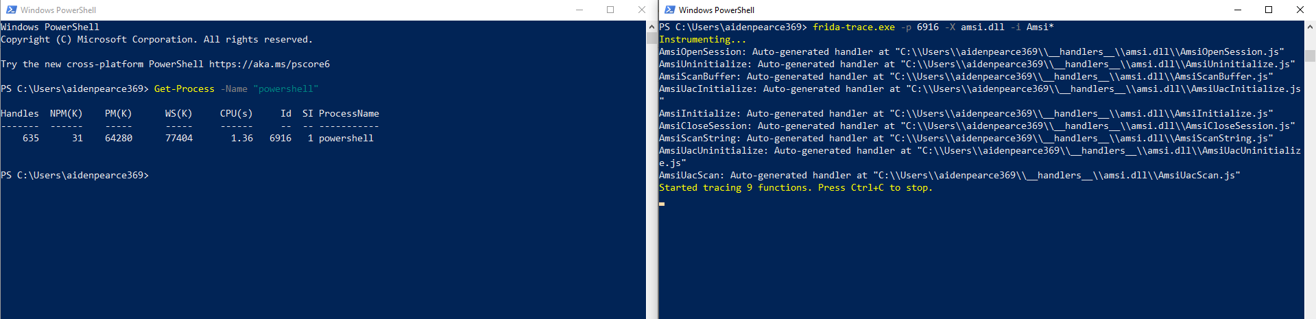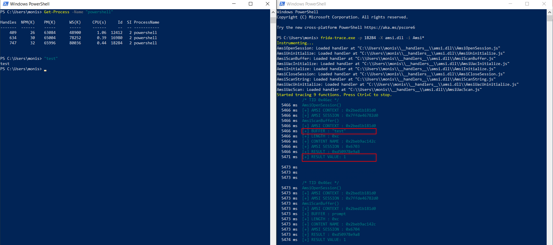 Using frida-trace to debug Win32 AMSI API Calls and generating output handlers to debug the AMSI functions,