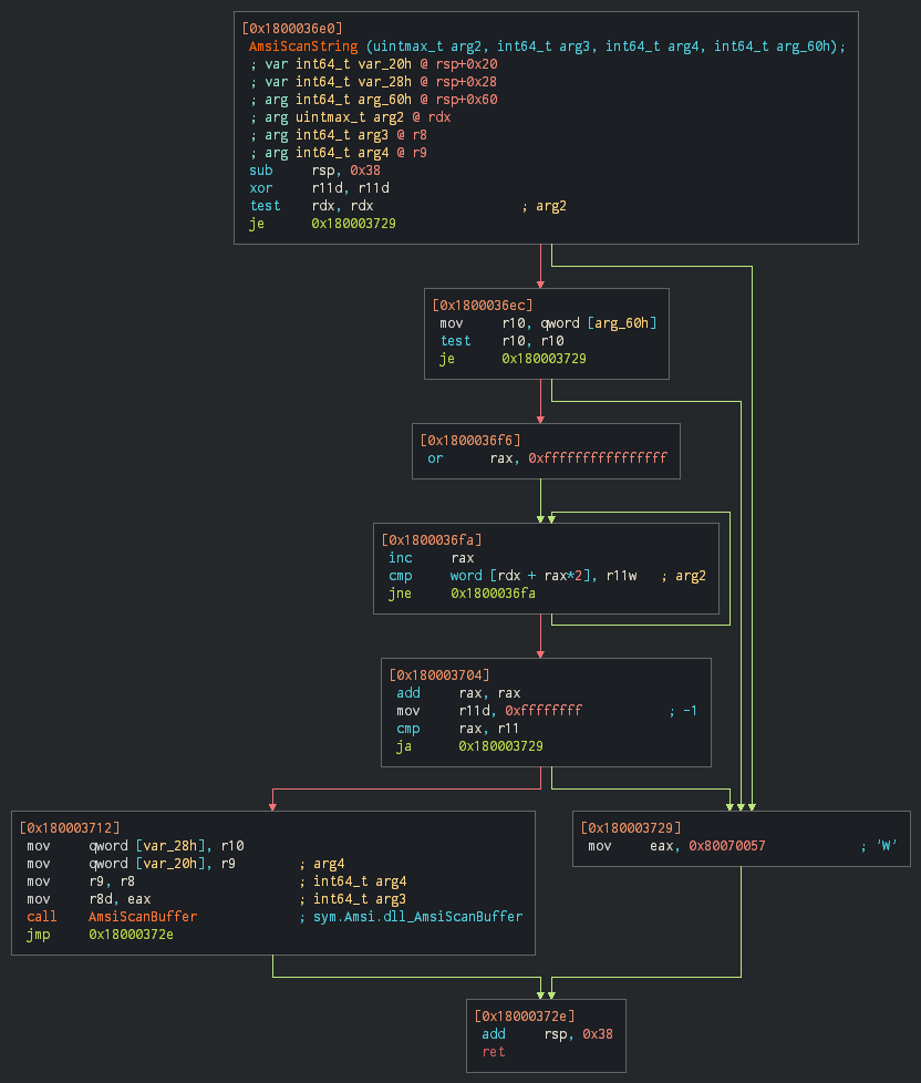 AmsiScanString calls AmsiScanBuffer, so if we patch these bytecodes in front of AmsiScanBuffer, AmsiScanString will also loose its power to detect