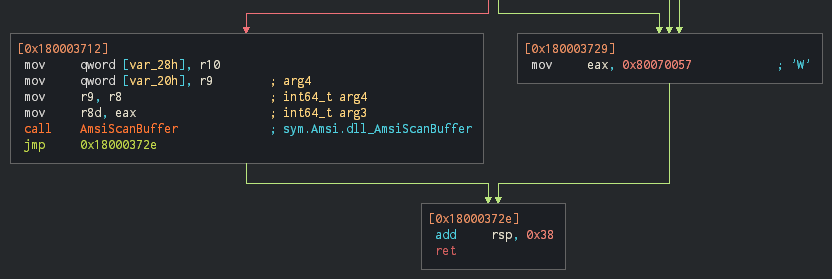 So if we use the right side block having 0x80070057 value in it before the scan, the function ends without scanning the fileless content and allows us to execute malicious payloads