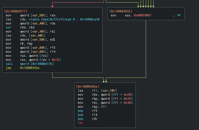Here this address 0x80070057 refers to E_INVALIDARG which gets stored into eax and returns as HRESULT of this function which is then processed as AMSI_RESULT_CLEAN