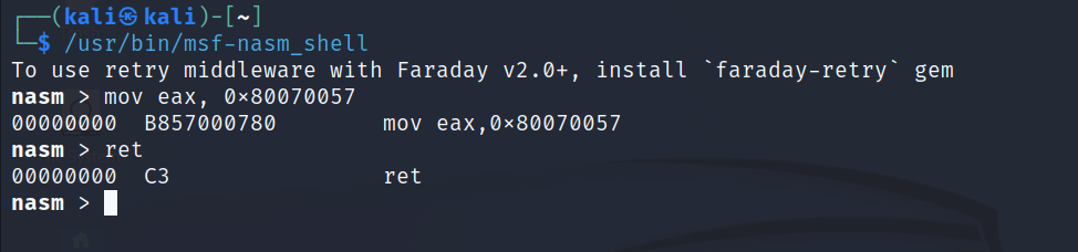 After this we have to perform ret to exit the function, so the bytecode for these instruction will be b857000780c3