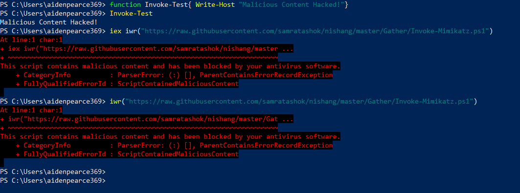 These strings doesn't seem to trigger AMSI while loading our file less content. Lets see how it detects some realtime badass malicious script, Mimikatz