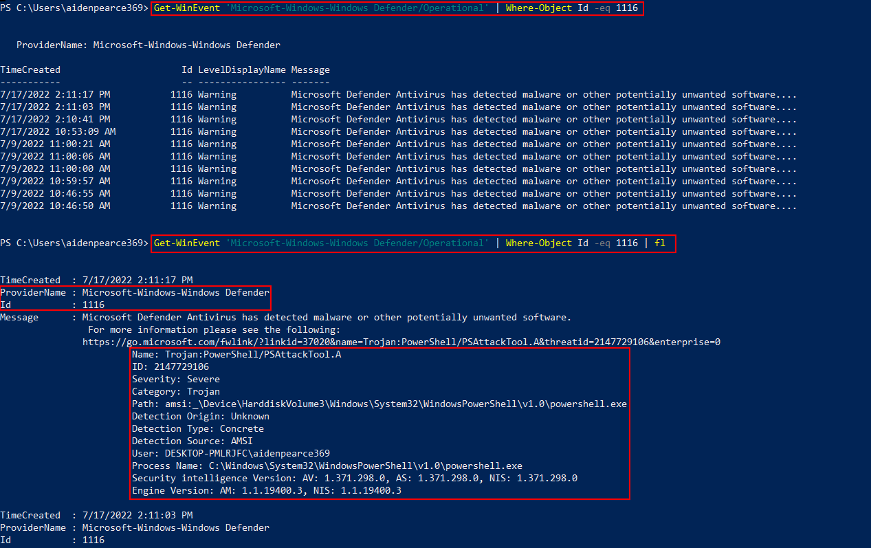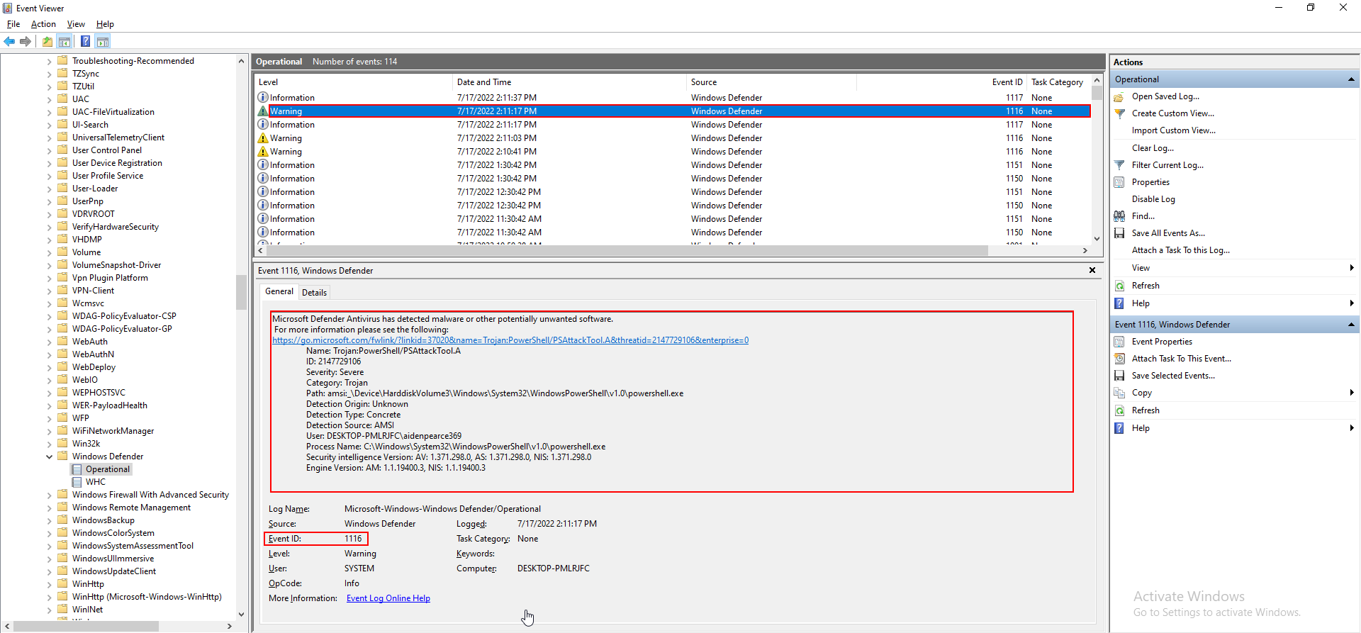 When we try to load Mimikatz into memory, it gets detected by AMSI and raises an alert to the Windows Defender because it has malicious content which got detected before. This gets stored in Windows Event Logs with the event ID of 1116