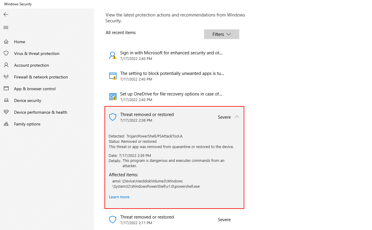 We can see that our previous incident is stored and the threat is removed by Windows Defender