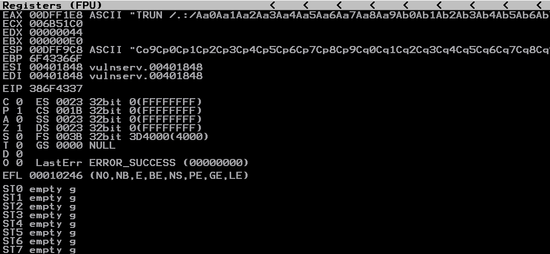 From this we can confirm that, TRUN command is vulnerable to Buffer Overflow attack