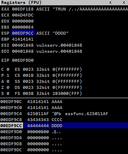 We could also see that the data passed into the Vulnserver using TRUN command in the Registers window,