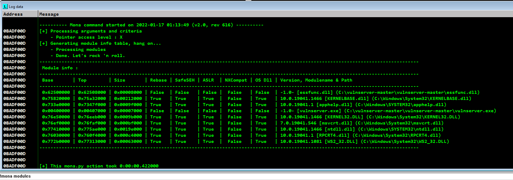 Finding the offset of jmp esp opcode using mona by the command !mona find -s \xff\xe4 -m essfunc.dll,
